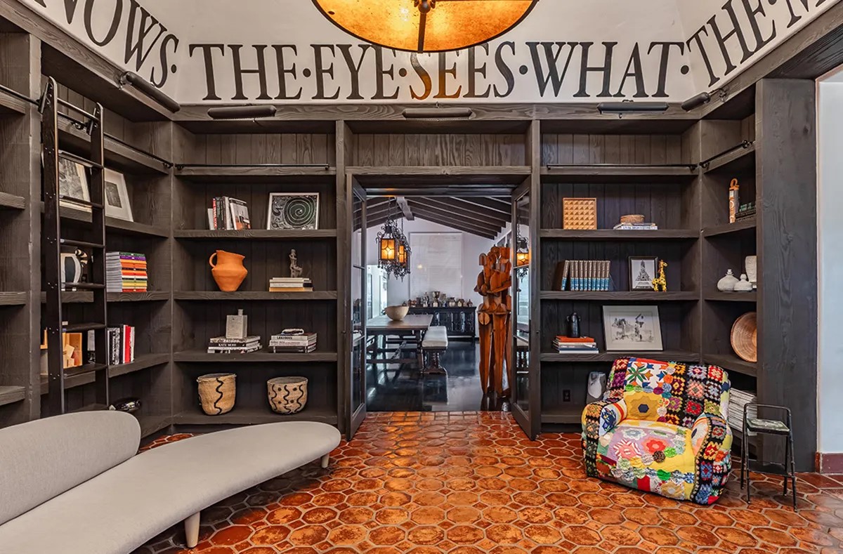 這棟面積約235坪的住宅,擁有6間臥室與9間衛浴。踏入玄關,迎面而來的不是單純的門廳,而是一座與圖書館結合的空間。挑高的格局經重新規劃後,牆面成為書櫃,陳列著藝術與建築書籍,與早期加州的陶器與文物。這個區域成為整棟房子的亮點,並且書架上方的格言「The eye sees what the mind knows(眼睛只看得見頭腦準備好要理解的事物。)」充滿哲思。