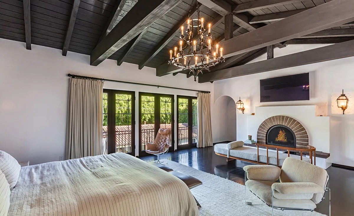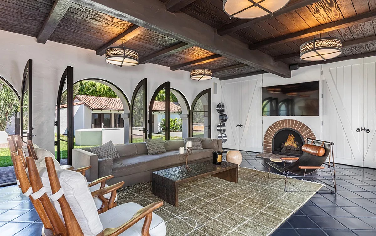 從玄關直走,則是主餐廳,空間通透開放,深色木質家具與吊燈延續整體語彙,帶出一絲古典的沉穩。穿過餐廳,可見另一處起居區域,家具色彩轉為明亮飽和,氣氛更為輕盈活潑;而拱形壁爐的再現,仍維繫了風格的一致性。庭院另一側的起居區則顯得成熟內斂,大片拱窗引入自然光,使整體明亮而柔和,展現加州住宅特有的舒適感。