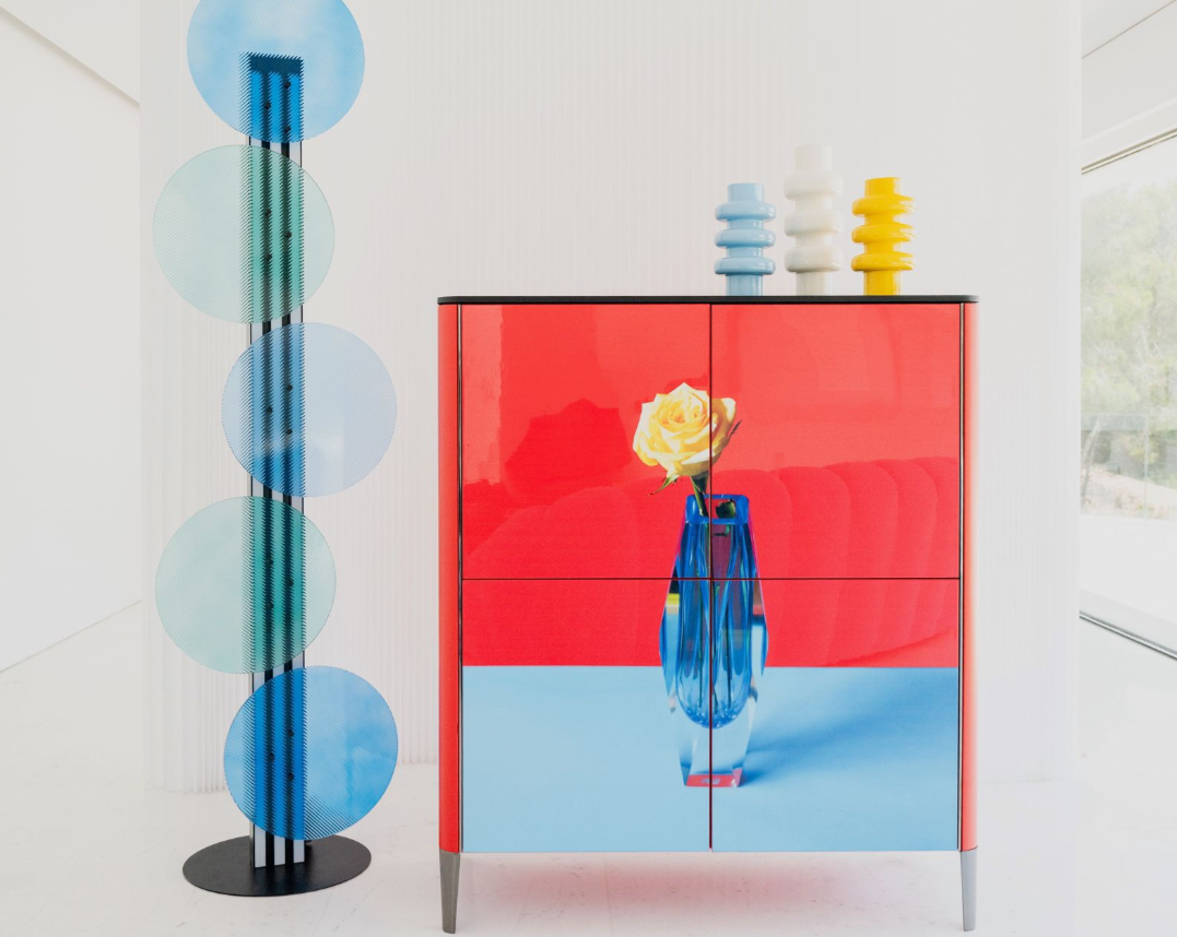系列還有一款以鍍鉻鋼製櫃腳支撐的〈Rondo 2〉儲物櫃,這款儲物櫃採用中密度纖維板製成,並在轉角處做圓潤處理,共計有四款花色呈現,這些印花靈感,同樣來自Pedro Almodóvar的經典電影海報,帶有普普風格的呈現,可以為空間增添不少藝術張力。