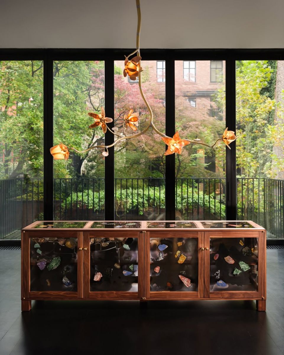 「Stone Rose Horizontal Chandelier 01」玫瑰吊燈(上)與「Geo Credenza」矮櫃(下)。