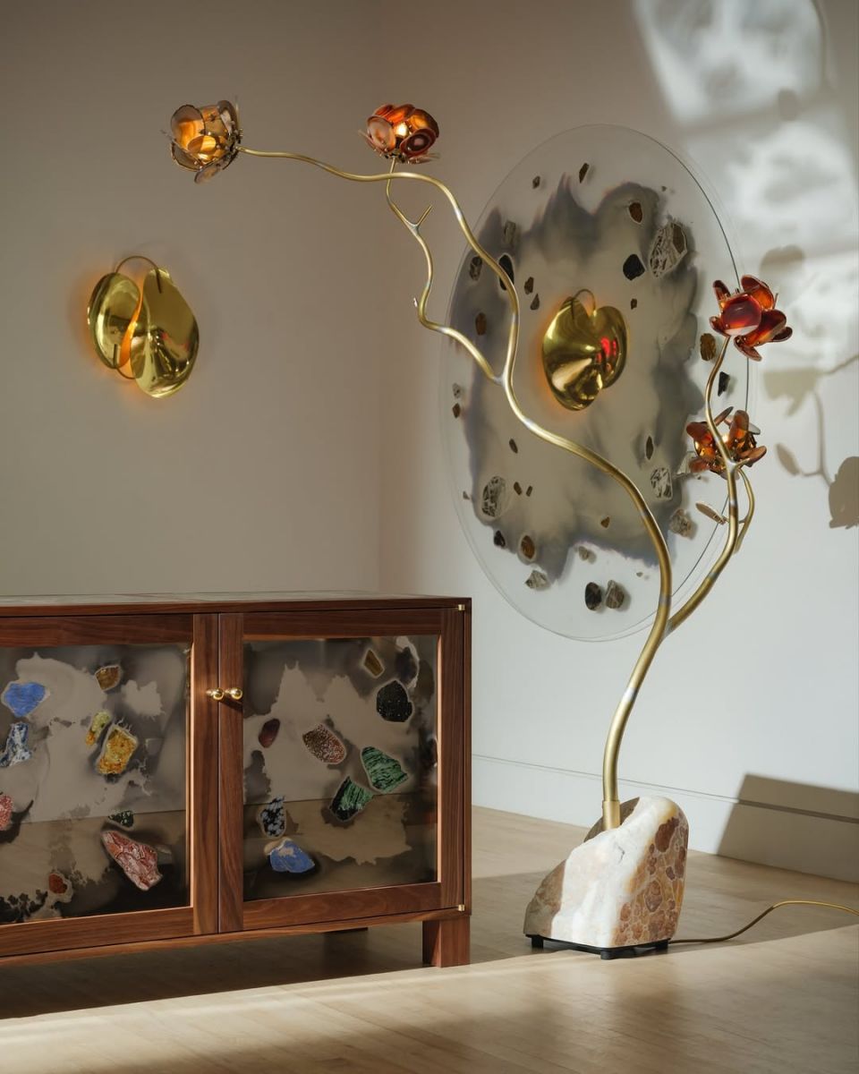 具備不同尺寸規格的吊燈,以及落地燈版本的玫瑰燈飾,同樣帶有「自然的原味」。作為燈罩的玫瑰花是由瑪瑙打造而成,設計師看中瑪瑙歷經時間沉澱所凝成的斑斕的條帶,選擇了黃銅塑出線條蜷曲優美的莖枝,與瑪瑙的紋理相呼應。並且細看能發現,轉角拐彎處,有著銀色色澤,那是Chen Chen & Kai Williams刻意為之的效果,使其無論在形狀,或是色彩的維度,都有更豐富立體的呈現。也透過對自然有機曲線的模擬,自然與人工的界線變得模糊,作品顯得更加有整體感。
