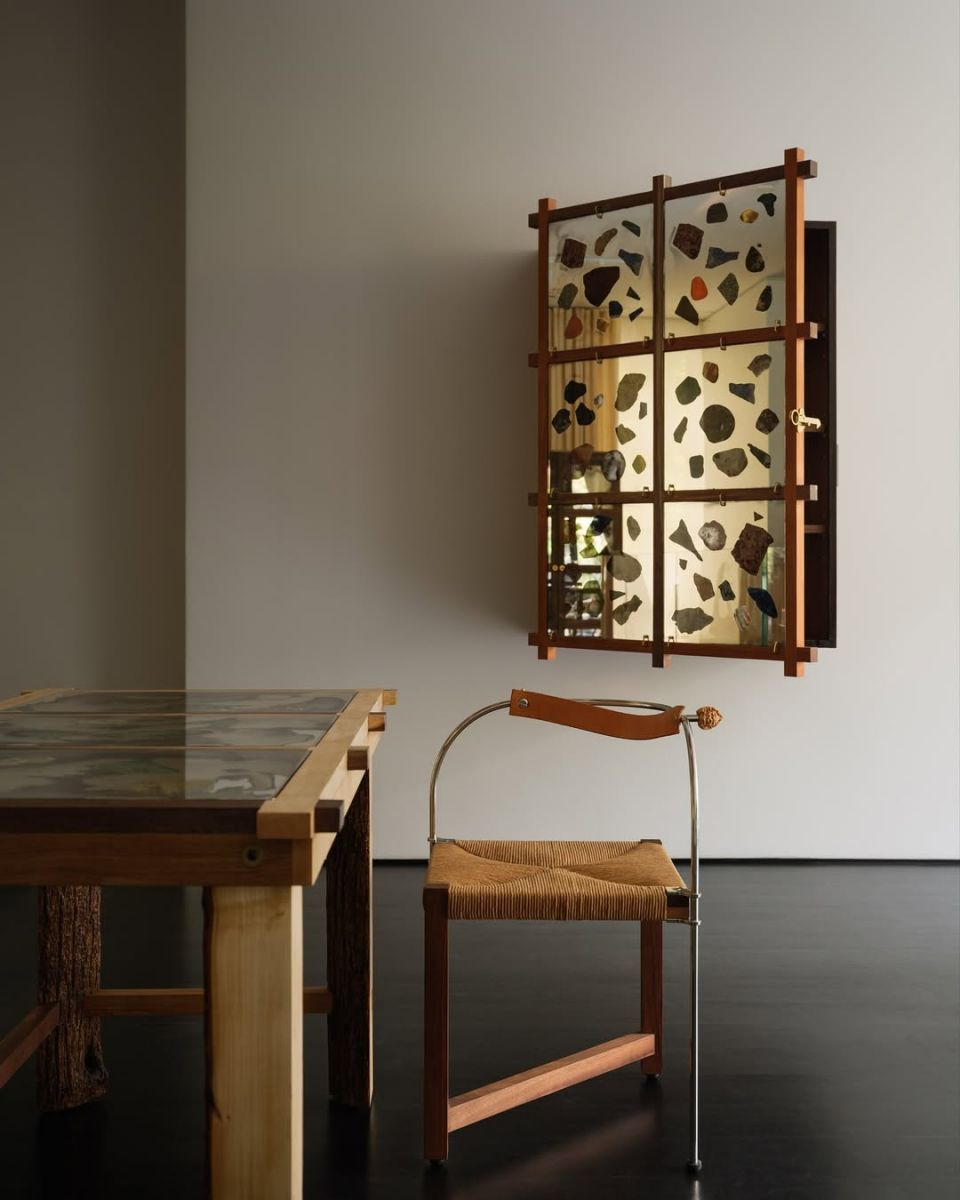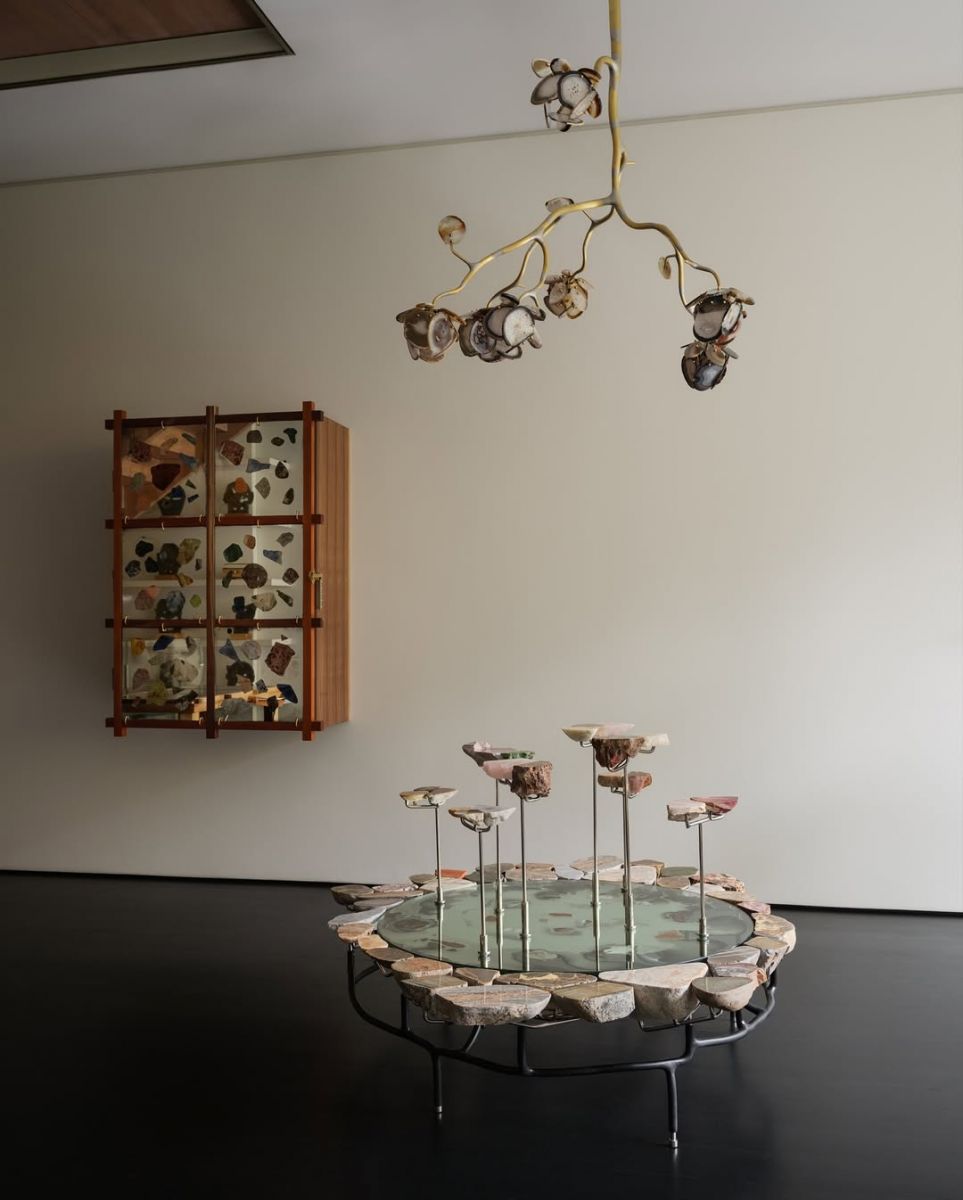 展示中的幾件大件作品,包含矮櫃、立櫃、牆面櫃與桌子,則都置入了各式不同紋理的石材。可以見到嵌有石材的鏡面,被用在櫃門或桌面上。Chen Chen & Kai Williams將切片石塊透過紫外線固化到一塊透明玻璃上,接著將硝酸銀溶液倒在玻璃上,透過化學反應形成鏡面層。並透過減少硝酸銀溶液用量,使鏡面邊緣以不規則狀逐漸過渡到透明。充滿實驗性的同時,Chen Chen & Kai Williams也以石材作為壁掛或者結構所需的固定點,再度發揮他們將自然元素巧妙與人工結合的特點。