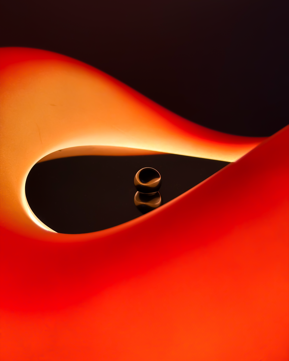 外觀上,燈體以流線型的「無限形體」為核心,正面看是一個完整圓環,側面則轉化為帶有動感的無限符號輪廓。燈體外殼採用壓克力製作,並透過特殊噴色工藝完成,讓色彩在半透明材質中呈現層次感與深度;光線穿透後不會過於銳利,而是形成柔和漸變。底座則選用鏡面不鏽鋼,使光在發光與反射之間來回折射,強化整體「無限循環」的視覺印象。