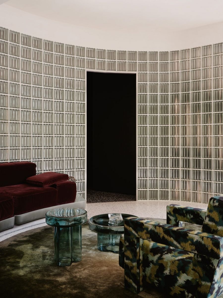 已經有了一處強烈的視覺主體,設計團隊在客廳的其他家具方面,則選擇與玻璃磚牆同樣色調的單品來襯托主軸。地毯是順著牆面弧度的圓形綠色絲絨地毯;Miniforms設計的Soda矮几由透明綠色玻璃製成;單椅也選用綠色系,但有迷彩般深淺不一的綠交織出變化感。並且可以注意到,這些家具的材質紋理也被限定在玻璃與絲絨這個範圍內,使視覺重點鮮明不雜亂。
