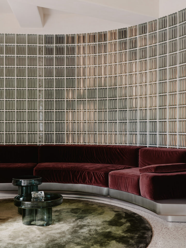 可以見到設計團隊的玻璃磚牆是選用無特別染色的、帶微微清透綠調的玻璃磚。搭配上絲絨面的深紅色家具,充滿對比的妙趣。紅與綠;絲絨的霧光與玻璃的亮面;扎實的色彩與半透的色感,從材質、色彩甚至虛實都在此衝突、碰撞出張力。