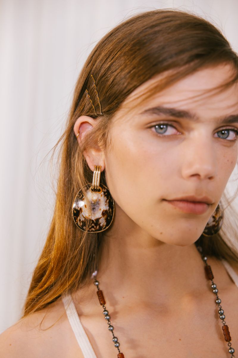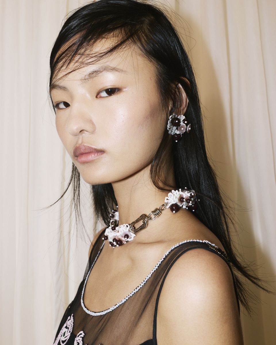 配飾延續繁複的設計思路。耳環與項鍊結合珍珠、玻璃花朵與珠飾,纏繞於鏈條上。部分外套的隱形縫線嵌入小巧貝殼,胸針則固定在服裝、肩帶或包款上。