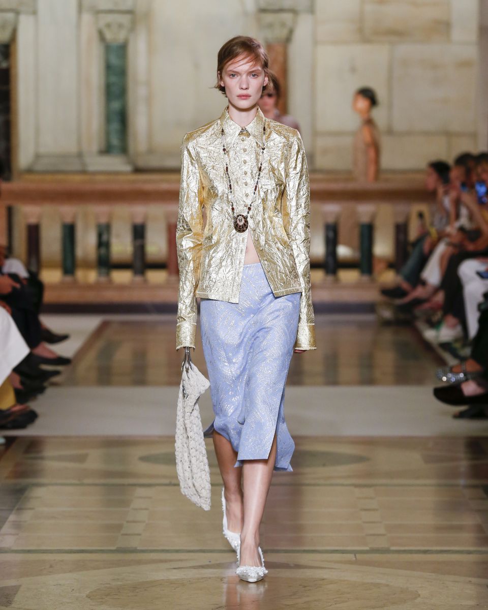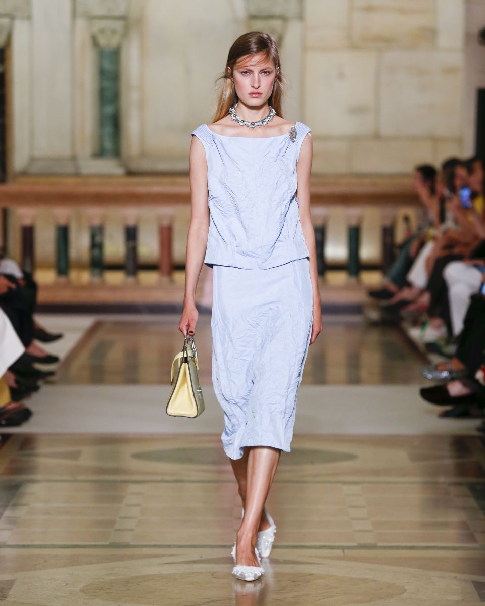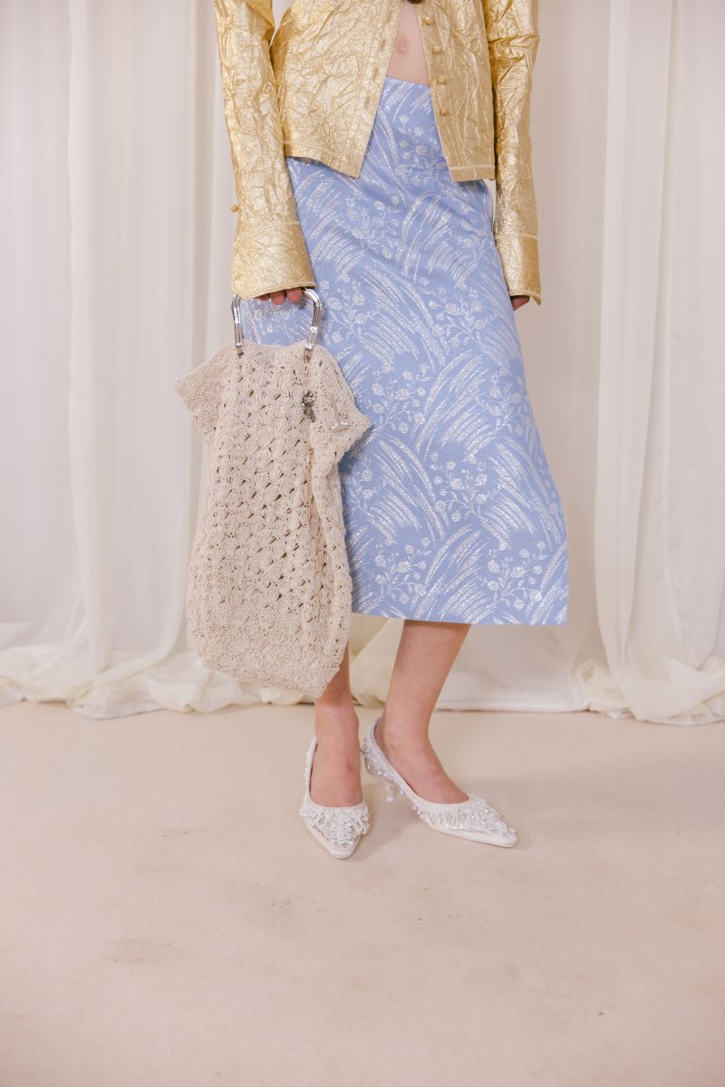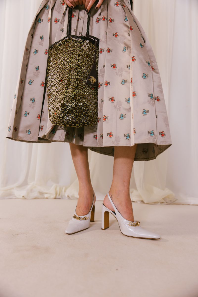 本季的服裝大量加入手工細節。開襟衫與織網洋裝由工坊工匠以全手工珠飾縫製,真絲雪紡的打褶與黏纖的壓褶也都出自人工製作。部分單品使用字母圖紋,靈感來自古董刺繡樣本,每個字母對應設計團隊中的成員。