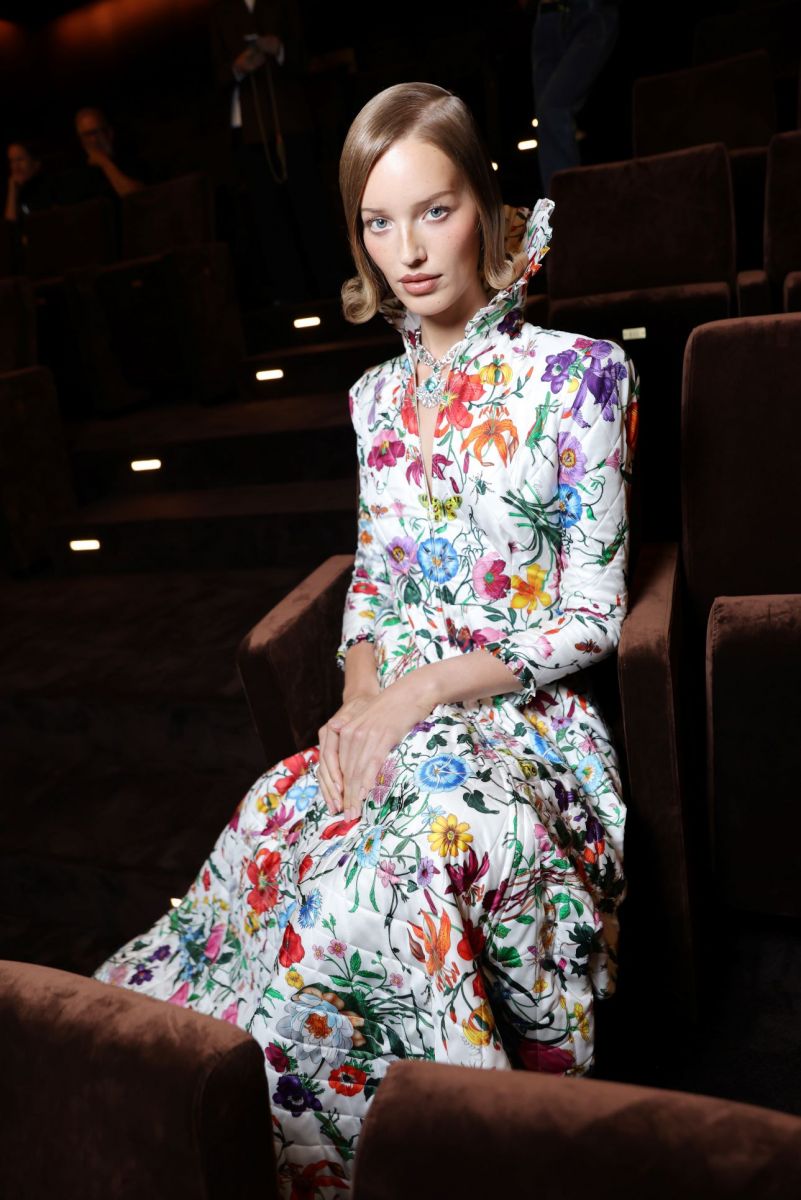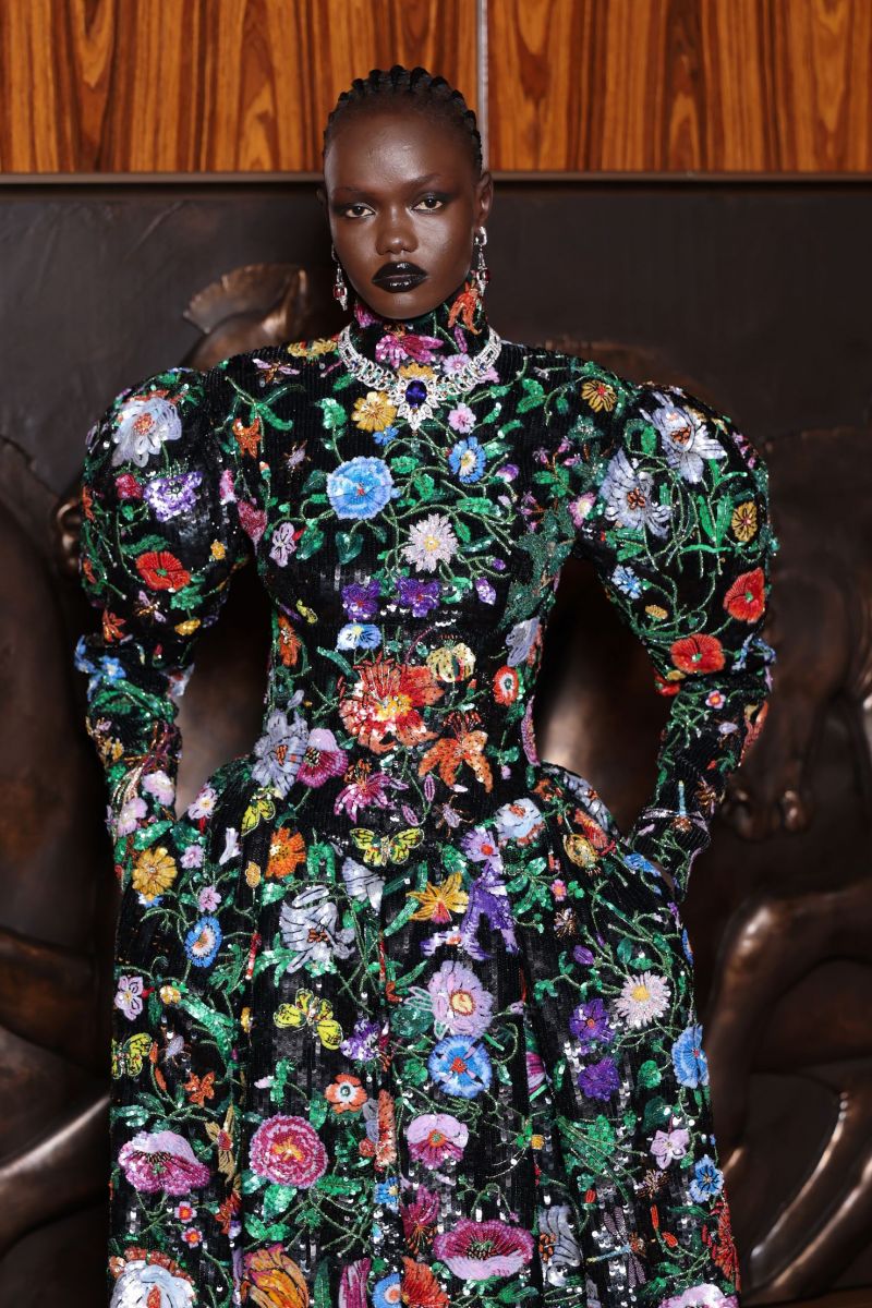 可以見到《La Famiglia》系列在設計層面有一定的豐富度,有透明輕巧或豐厚的材質;動物紋或羽毛、亮片珠繡等不同的紋理;Gucci傳承的GG Monogram與Flora花卉圖騰;結構立體的羊腿袖或自然順應人體曲線的肩線;直筒剪裁或大傘擺結構等等,令人還沒深入了解設計背後的想法,就先在視覺上過了一波癮。
