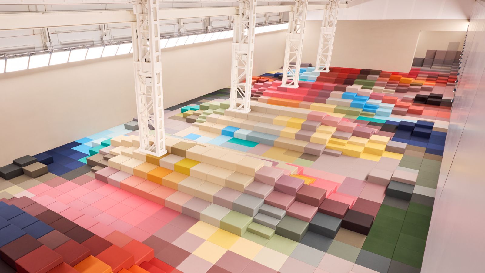 來到FENDI 2026春夏發佈現場,彷彿進入一個數位世界,繽紛的色塊有如像素網格一般。這種像素化的呈現,是本次的場景設計師Marc Newson將本季服裝中的花卉圖樣,結合拼布,以及影像數位化的進程概念,重新拆解、重構,才形成有如「等待影像載入中」的視覺效果。這樣的場景看起來就像現實與虛擬重疊的遊樂場,與系列的可愛氛圍相互呼應。