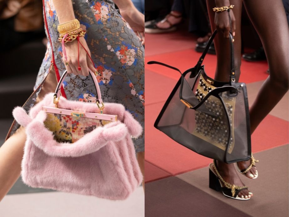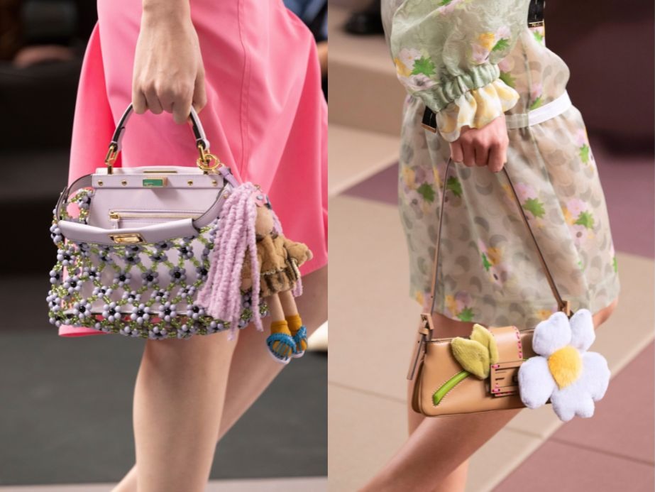 包袋成為本季最具驚喜的設計之一。外觀上除了有花卉串珠、編織或鏤空等多元造型,內裡更是暗藏驚喜。像是經典的Peekaboo的內部,就有亮片、串珠構成的一幅幅華麗圖景閃耀其中,自成一個繽紛宇宙。