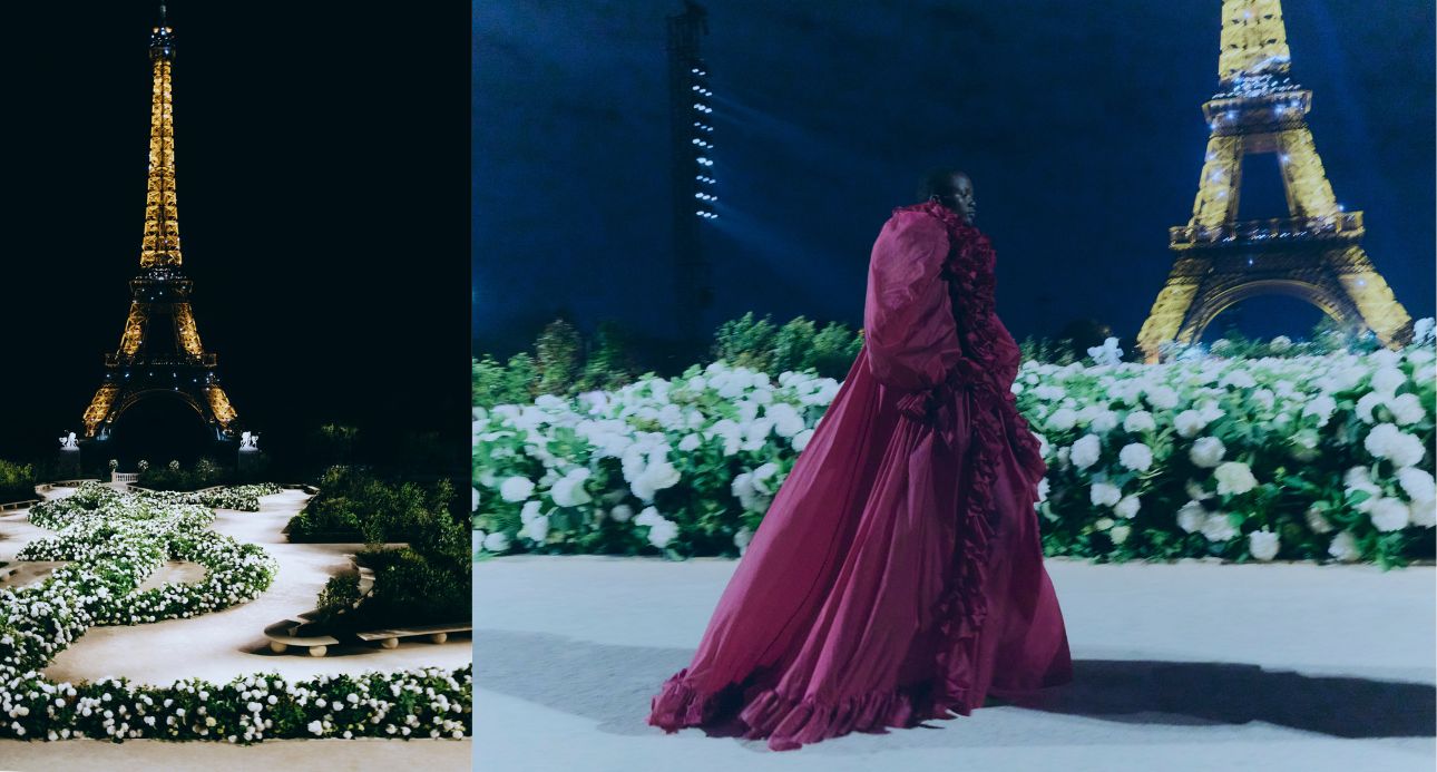 本季秀場位於巴黎鐵塔下的Trocadéro,這裡被打造成四周滿是白花的花間小徑,本季應用廣泛的輕薄面料隨著模特行走間與夜風互動,帶來神祕浪漫的氣息。
