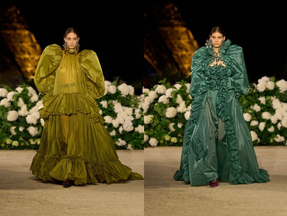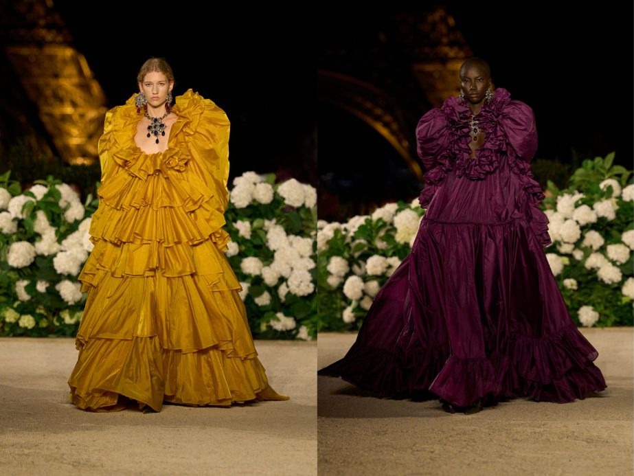 除了品牌持續存在的、上寬下窄的到三角廓型,本次還加入戲劇化的古典禮服輪廓,可以見到誇張的袖型、體積巨大的裙襬與層疊的荷葉邊,讓人不禁聯想到昔日貴族的浪漫風華。