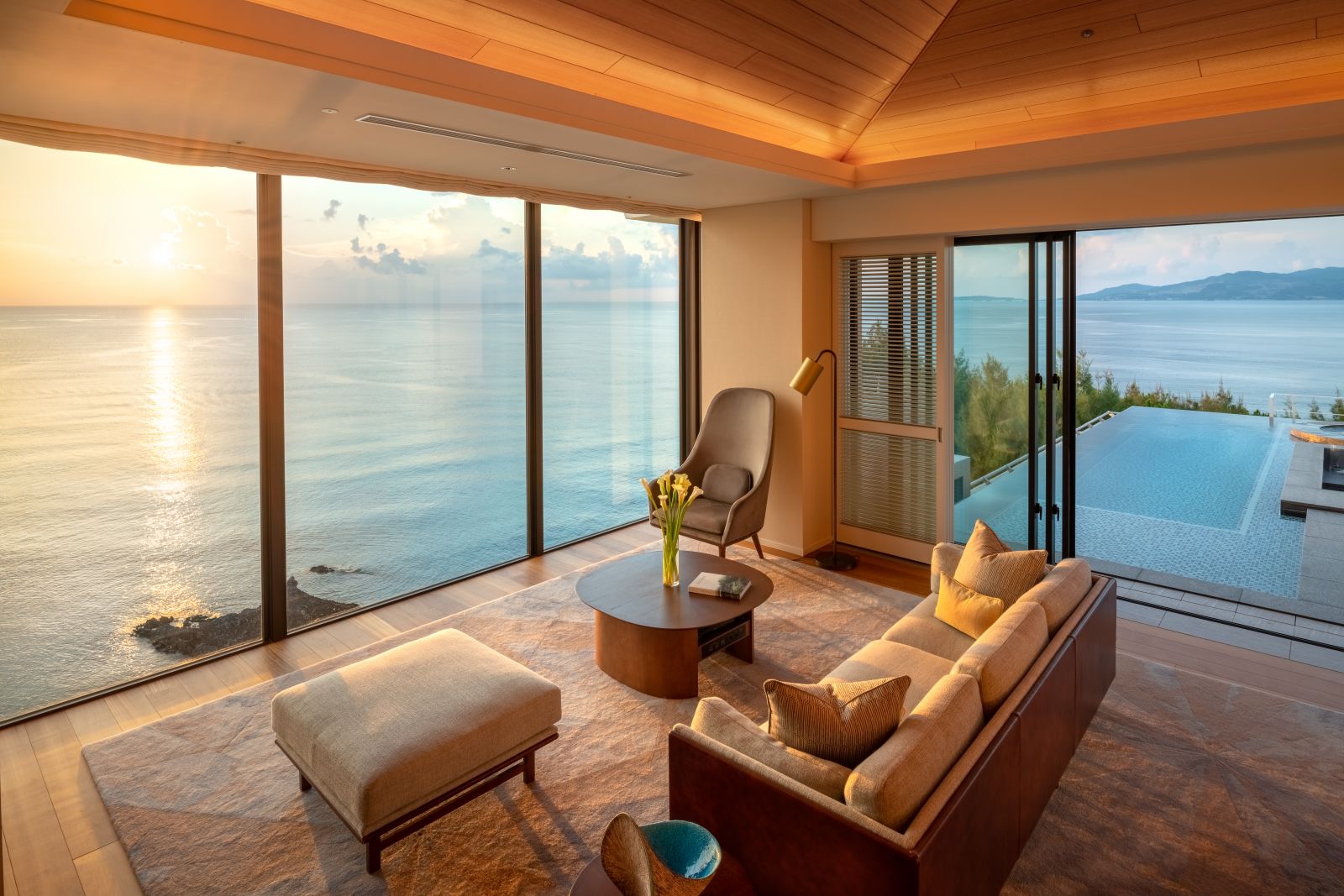 度假村內的五棟獨棟別墅採用沖繩傳統的赤霞朱紅磚建造,隱身於海岸懸崖上,可以從高處將海灘美景盡收眼底。每棟別墅皆配備私人溫水泳池與天然溫泉浴池,空間融合現代建築語彙與地方精神,帶來如靜謐沉穩的隱逸感。