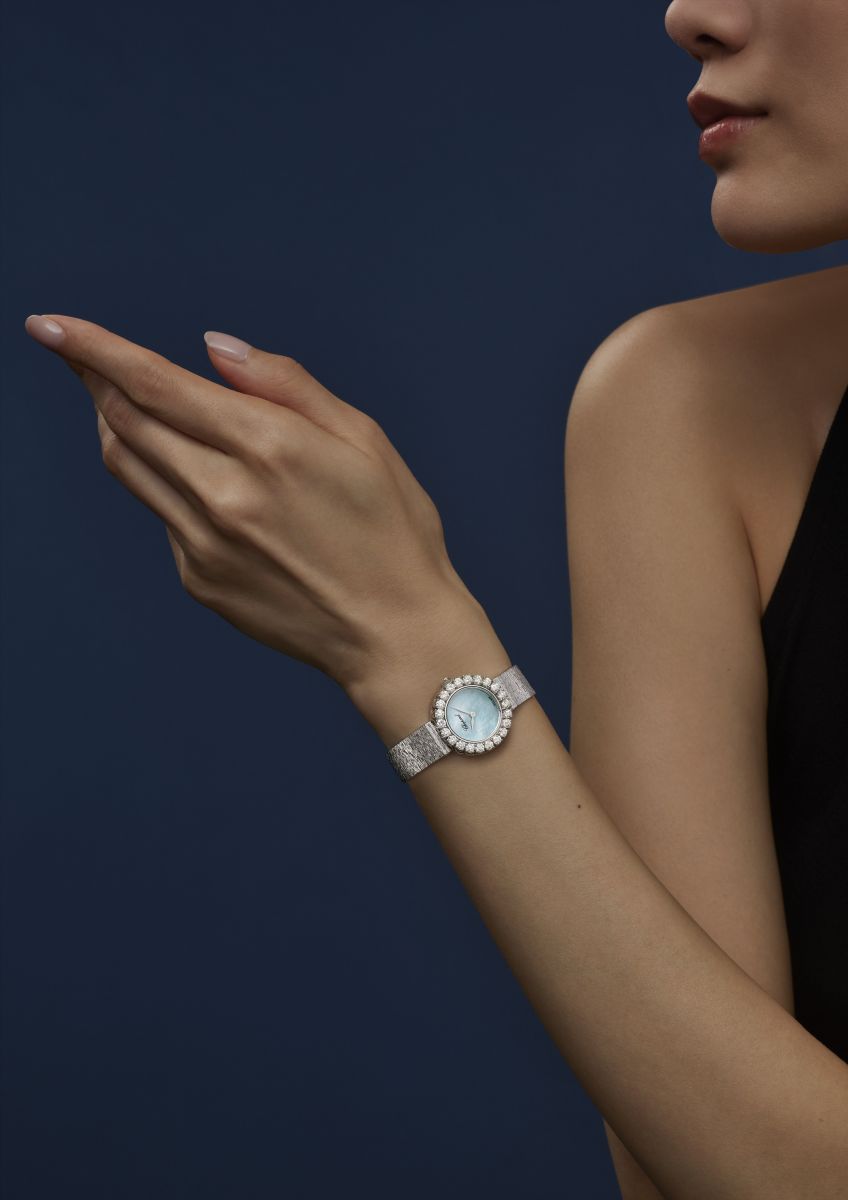珍珠母貝是製錶中經典且雋永的材質。此款以淡藍色珍珠母貝打造錶盤,並搭配品牌經典的手工樹皮刻紋18K白金錶鏈,紋理細膩柔軟貼腕,展現金屬工藝的精湛技術與優雅氣度。