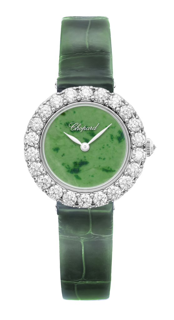 系列中最具代表性的設計之一,是運用翡翠打造的錶款。翡翠自古在東方文化中象徵護身與祈福,在西方文化中亦被視為具療癒能量。能夠切割成薄片的高品質翡翠極為罕見,因此兼具文化寓意與工藝挑戰。此款腕錶以18K白金錶殼與2.35克拉鑽石環繞翠綠錶盤,皮革錶帶呼應翡翠深淺交織的盈潤色澤,流露古典優雅氣質。