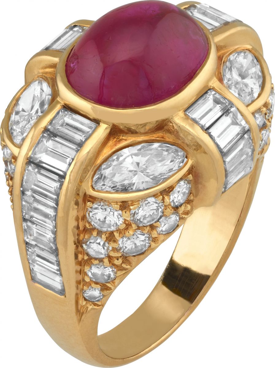 1982年的戒指,以黃K金、紅寶石、鑽石製成。