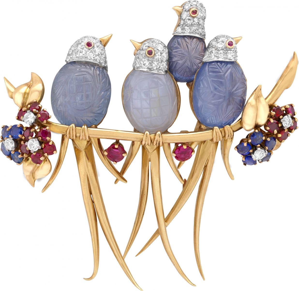 1946年的Bird胸針,當時流行描繪溫馨柔美的畫面,表達對和平的嚮往,材料有鉑金、黃K金、紅寶石、藍寶石與鑽石。