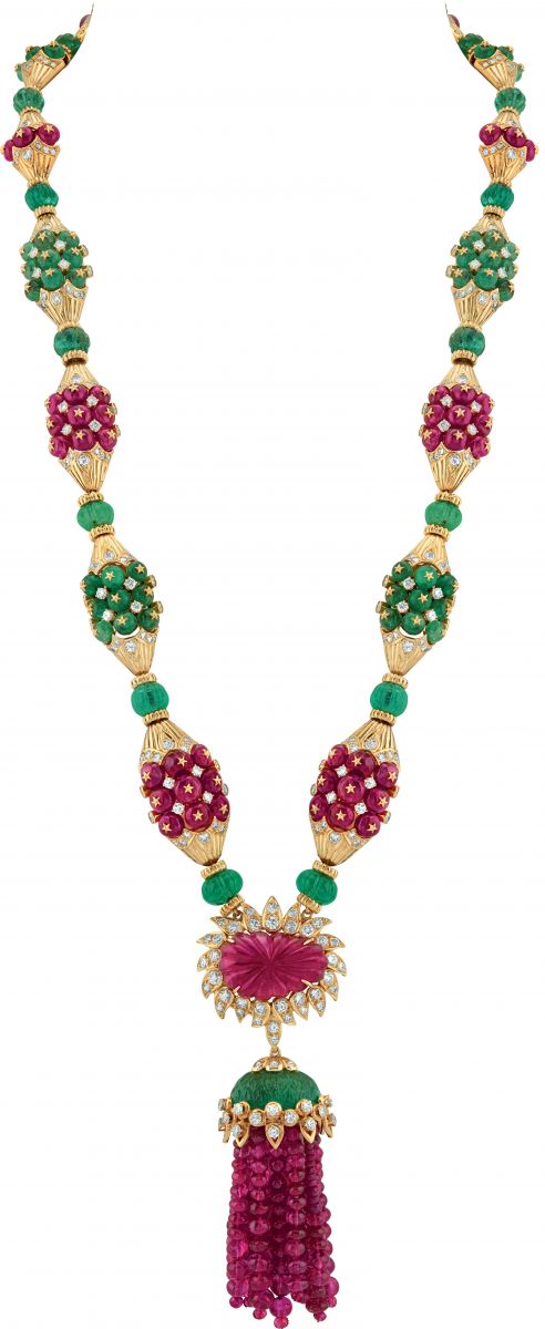 1975年的項鍊,受印度藝術風格影響,色彩飽滿艷麗,由黃K金、紅寶石、祖母綠與鑽石打造。