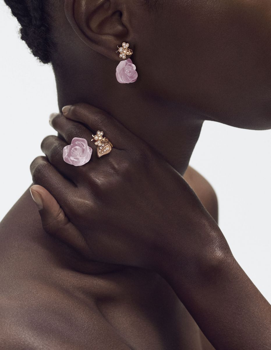 在本次La Rose Dior大系列中,包含三個不同調性的子系列。首先看到Rose Dior Pré Catelan系列,系列共推出項鍊、耳環與戒指三件作品,皆以玫瑰金結合玫瑰石英與鑽石,具象呈現玫瑰柔美的姿態。細看之下,還能發現一隻小巧的蜜蜂停留於花瓣與葉片之間,使整體更富生命力。