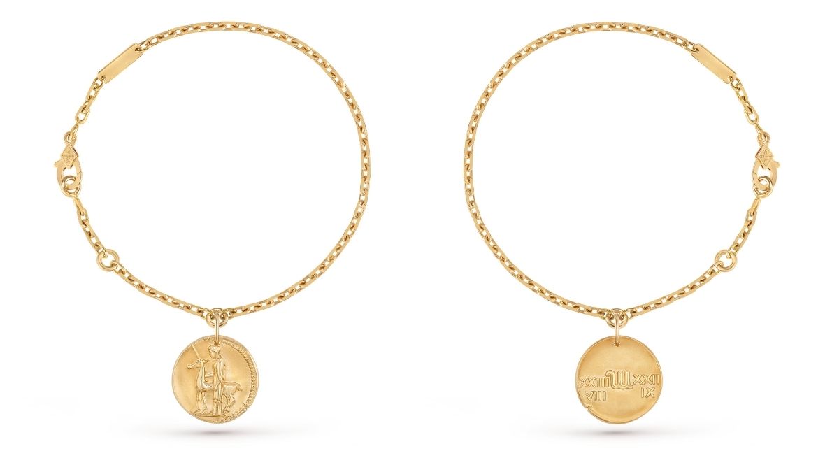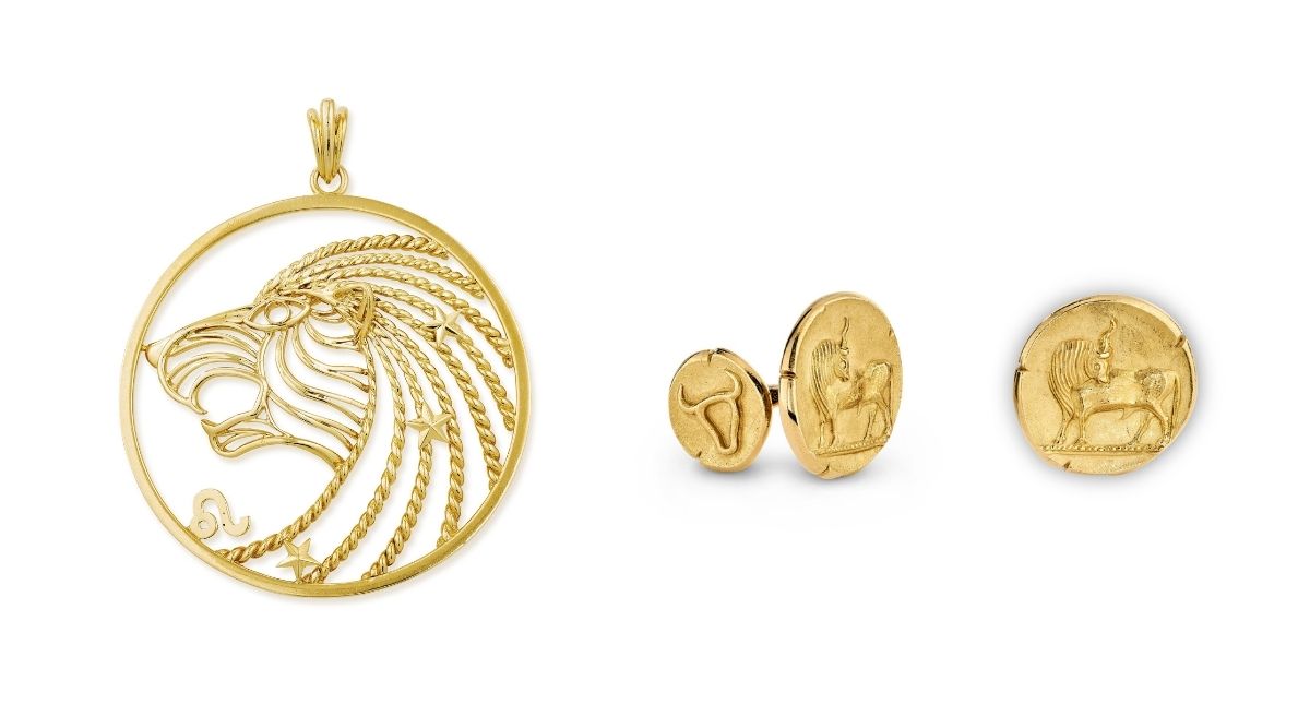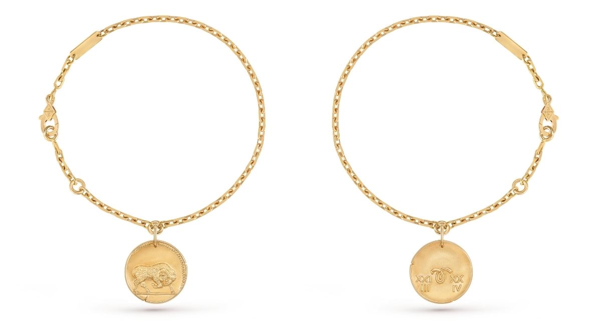 這十二款金質圓墜手鍊,以黃K金為材質,其圓墜的大小經過精心調校,最終得到16毫米的直徑,而手鍊的鏈條以金絲繞成,能與纖麗的手腕配合得宜。圓墜兩面分別是浮雕效果的西洋星座圖案,以及其代表符號和羅馬數字日期,精巧細膩。圖案皆遵循星座傳統符碼,並將其代表氣質刻畫得栩栩如生。可以見到處女座圖案以少女與獨角獸構成,頗有仙氣飄飄、完美到不食人間煙火般的味道;牡羊座則生動刻劃出其羊毛的鬆軟感,及符合其身為黃道第一宮星座那種蓄勢待發、勇往直前的無畏英姿;而獅子座做為王者氣息的代表,圖案靈感也參考古代藝術作品中的雄獅造型,將其霸氣威武的姿態凝縮在圓墜的一方天地。