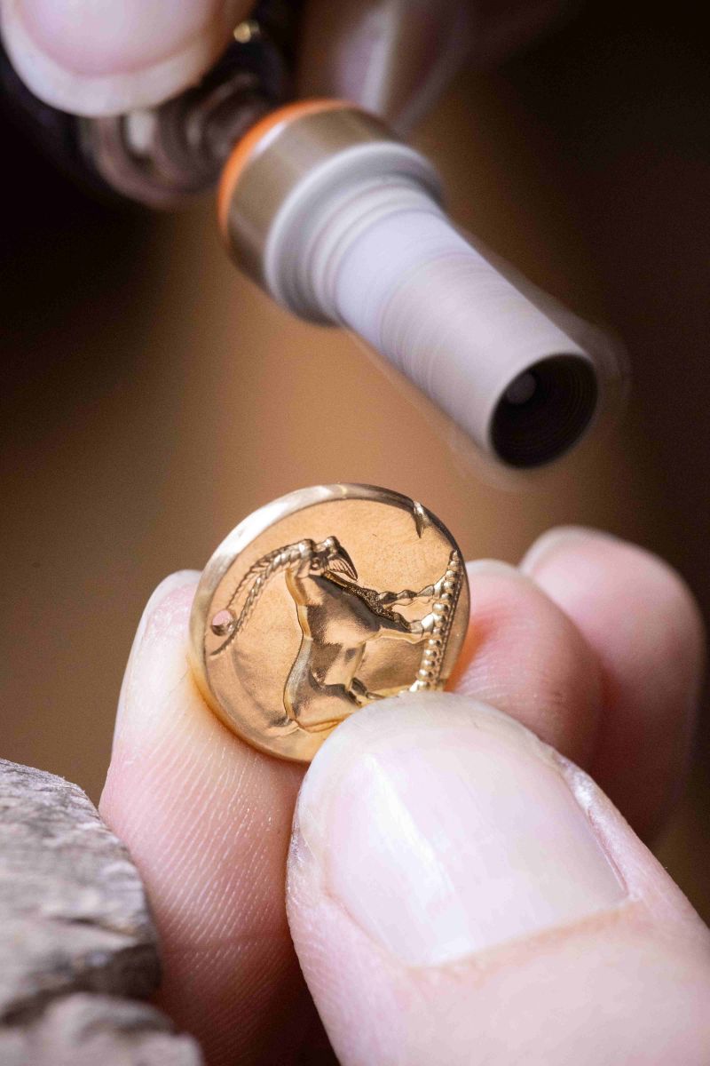 這些圖案都以傳承已久的壓印技術打造,根據不同的圖案設計,部分細節甚至需錘鍱八次,圖案成形後,還需經過細心拋光等表面處理,為圓墜鍍上猶如古錢般內歛細膩的光芒。儘管圓幣吊墜面積不大,仍然以最精細的製作規格精心打造。