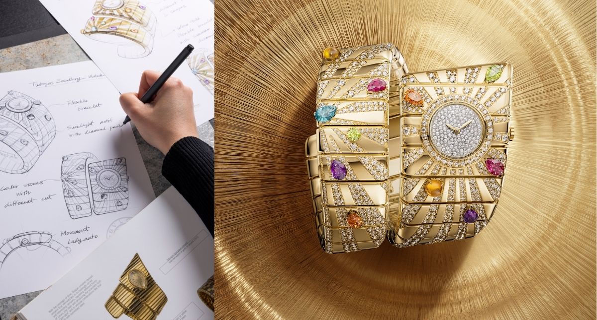 以品牌的Tubogas工藝為核心,這支錶有著經典的、如蛇一般的纏繞式外觀。黃K金單圈錶帶上鑲嵌近12克拉鑽石,並以錳鋁榴石、黃水晶、紅碧璽、橄欖石、紫水晶與拓帕石構築色彩序列,使色石在螺旋線條間形成活潑節奏,呈現義式珠寶的華麗能量。錶盤上密鑲約0.6克拉鑽石,直徑16毫米的錶殼搭配鑽石錶圈與透明底蓋,形成高級珠寶式的光面結構。內部搭載BVS100 Lady Solotempo寶格麗自製自動上鍊機芯。瑞士製錶的精準與羅馬珠寶的色彩張力在此合流,讓腕錶具備藝術感、佩戴性與機械表現的完整平衡。