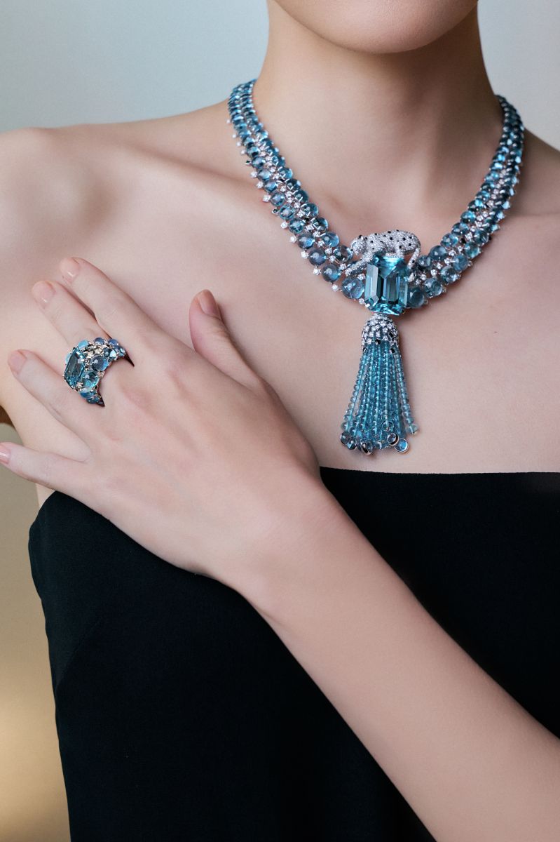 在本次展出的藍色調作品中,展現出由淺入深、極其細膩的層次演變。例如PANTHÈRE ALGARROBO項鍊以清透的海藍寶石為主體,藉由大量凸圓形寶石的精密排列,營造出層層遞進的湛藍光影;流瀉式的佈局,不僅賦予色彩如水般的流動感,更在視覺上塑造了具有方向性的結構。