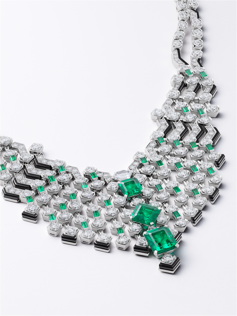 在綠色系作品中,卡地亞轉而強調色彩的張力對比與結構的視覺延展。TRAFORATO項鍊以深邃的哥倫比亞祖母綠為核心,大膽揉合縞瑪瑙,交織出鮮明且具現代感的「綠黑對比」。外圍細膩的幾何鏤空線條向四方延展,使整體展現清晰的結構張力,並引導視覺焦點自然匯聚於主石所在的中軸線上。